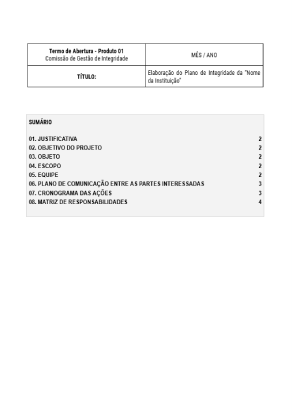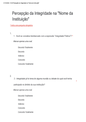 Modelo Levantamento da Situação dos Instrumentos e Estruturas de Integridade Plano de Comunicação Cronograma de Trabalho PPMI 2023 – Curso de Integridade Termo de Abertura PPMI 2023 – Curso de Integridade Plano de Integridade Pública Integridade Modelo Questionário de Percepção da Integridade – Formulários Google