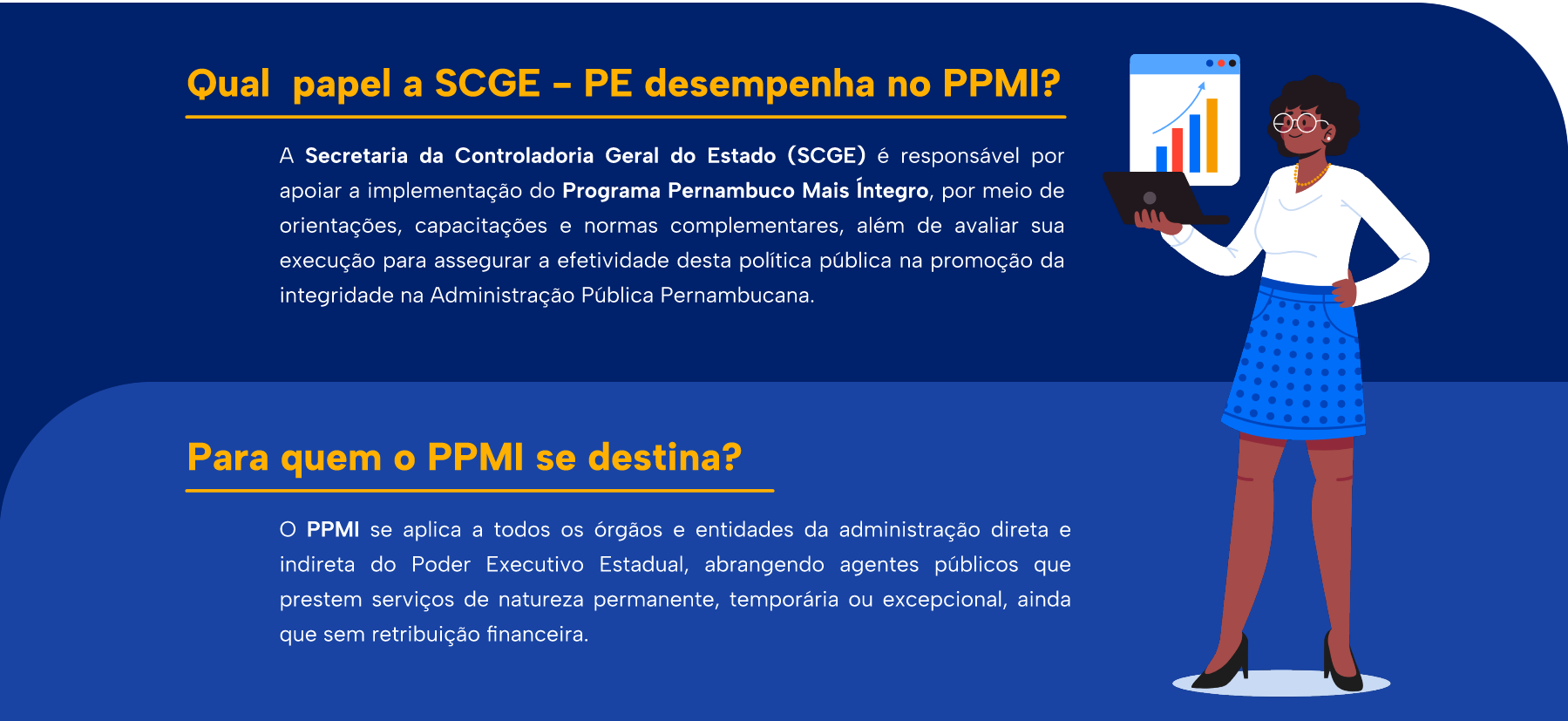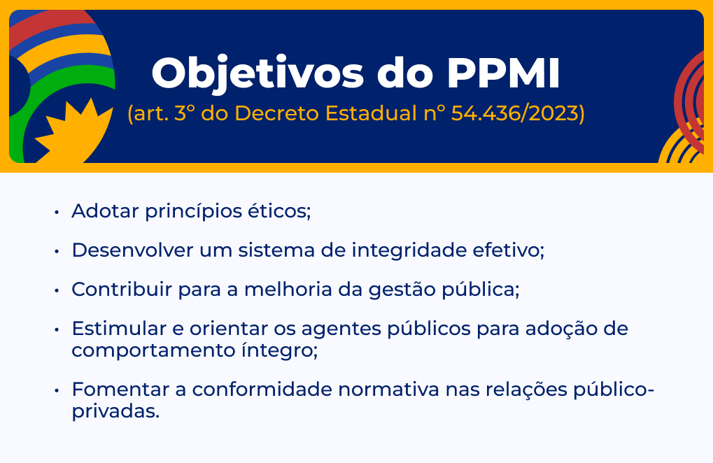 Instituído pelo Decreto Estadual n° 54.436, de 9 de fevereiro de 2023, o Programa Pernambuco Mais Íntegro (PPMI) visa estabelecer diretrizes e metas para promover a ética, integridade e probabilidade, além de garantir o respeito às normas que regulam as relações entre a administração pública e os setores público e privado. O programa também define a estrutura para os planos e programas de Integridade dos órgãos e entidades do Poder Executivo Estadual.